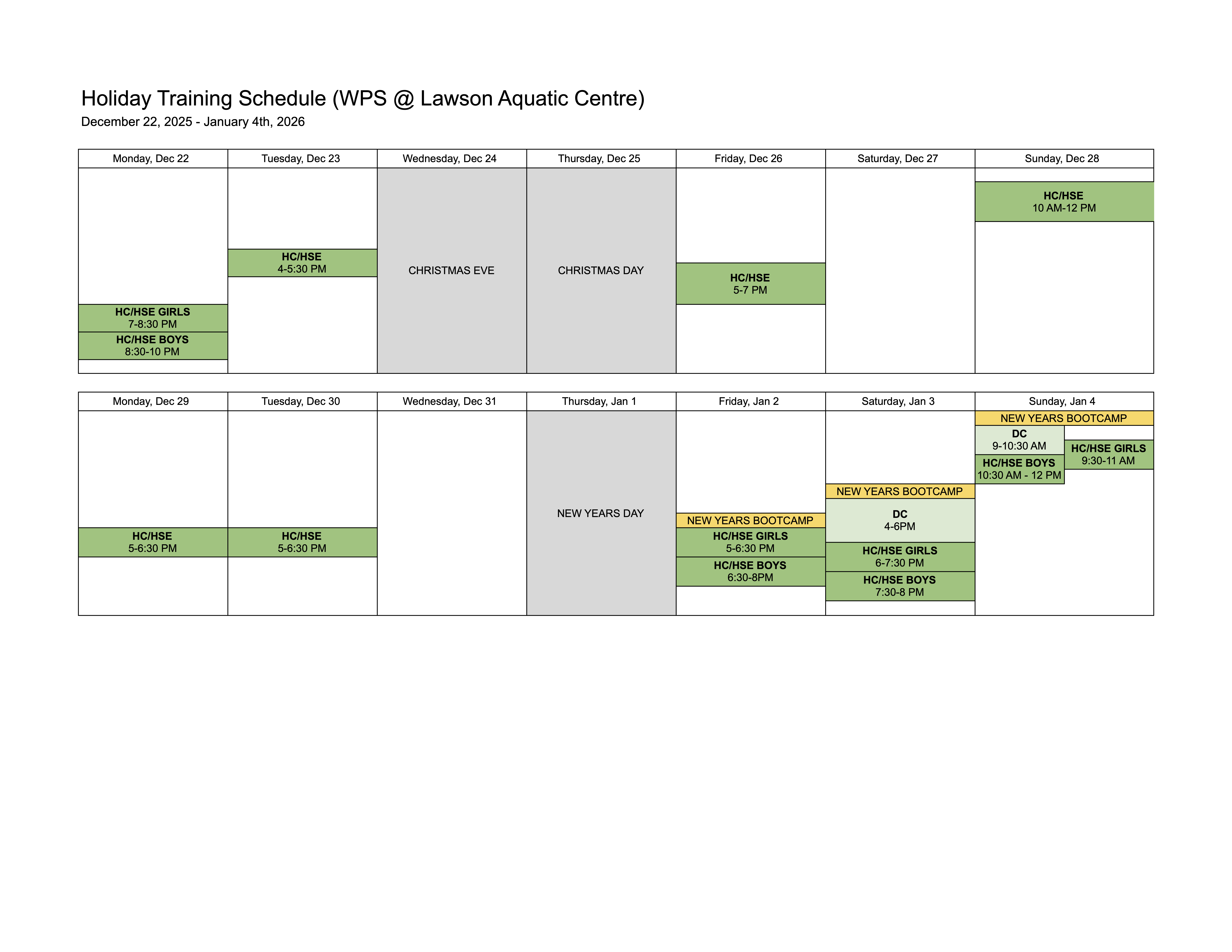2025 Holiday Training/Camp Calendar (Dec 22 - Jan 4)