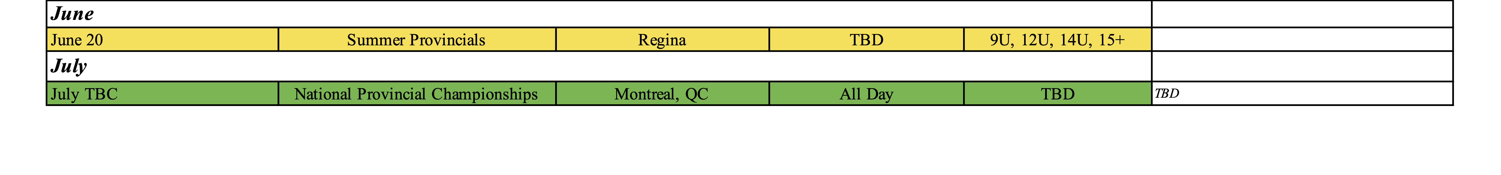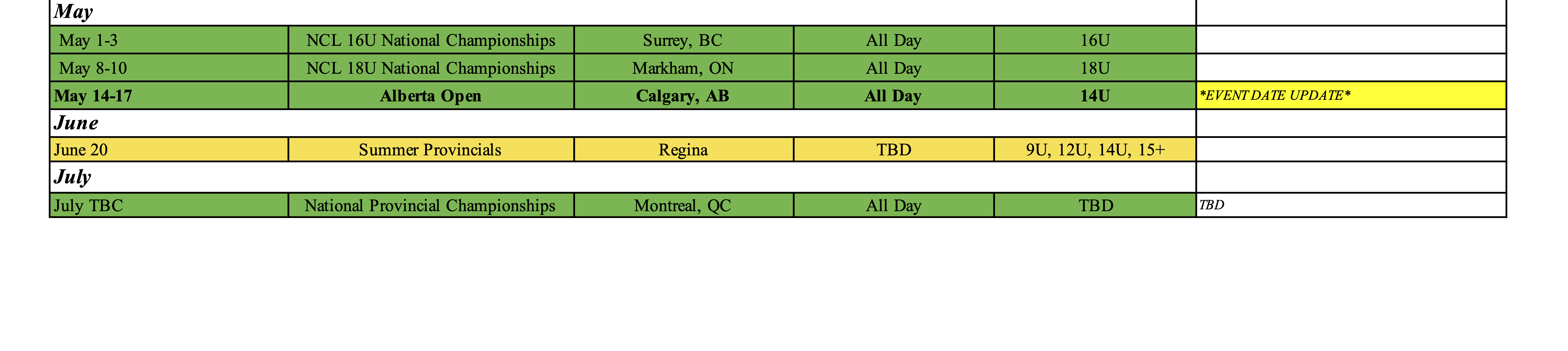 **Note, multiple events are marked TBC and will be confirmed or changed closer to the event date.